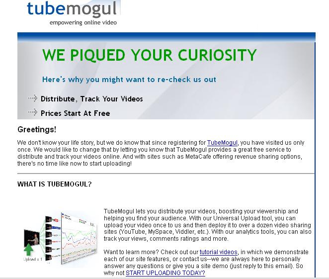 The Company: TubeMogul.com: This free online service allows users to upload a video one time and have it distributed amongst many different video websites.