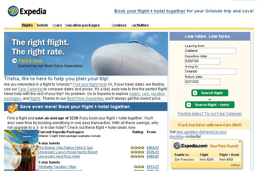The User History: a few days ago I booked a cruise vacation with some friends out of Port Canaveral, 60 minutes or so outside of Orlando. The trip isn’t for almost a full year, so I wanted to just get an idea of flight prices from Oakland to Orlando. I headed over to Expedia to just check out the price ranges and get a feel for how much I’ll have to put aside for a flight. Since the trip is next February, I don’t plan on actually making this purchase until sometime this summer or next fall.