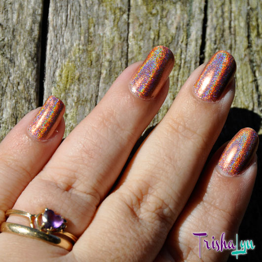 Indoor lighting just did not do this polish justice, so while we were out exploring Fort Humboldt, I put my hand against this huge redwood tree stump that was twice as tall as I am (which isn’t hard at 5’3″) and took a nice shot in the late afternoon sun. You can see the spectrum of holographic reflection and the nice warm orange.
