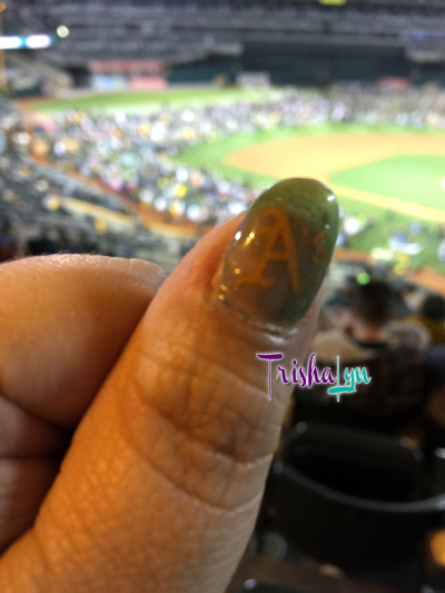 I have been remiss in my baseball fandom this year and it took me until the middle of June to get my ass in gear to see my Oakland Athletics in person! Lorenza & I took advantage of her half off coupons and went to the June 19th game against the Los Angeles Angels. I wish I could say they won, but at least I got a decent manicure out of it!