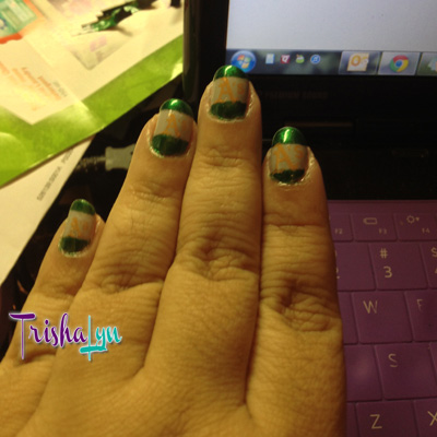 Back to this year. I went with a different look this year. I wanted something like a jelly sandwich look, so I used a couple of coats of the OPI Sheer Tints I’m Never Amberassed (yellow) and then a couple of coats of OPI Sheer Tints I Can Teal You Like Me (blue) over it to achieve a green that was pretty close to the A’s green. I cut out one of the nail tattoos and put them just on my thumbs. Even as light as the green is using the Sheer Tints, the A really doesn’t stand up well against it. I guess I’ll just have to break down and either use the nail tattoos on a white polish, which I’m not a huge fan of, or on bare nails, which is nearly sacrilege!
